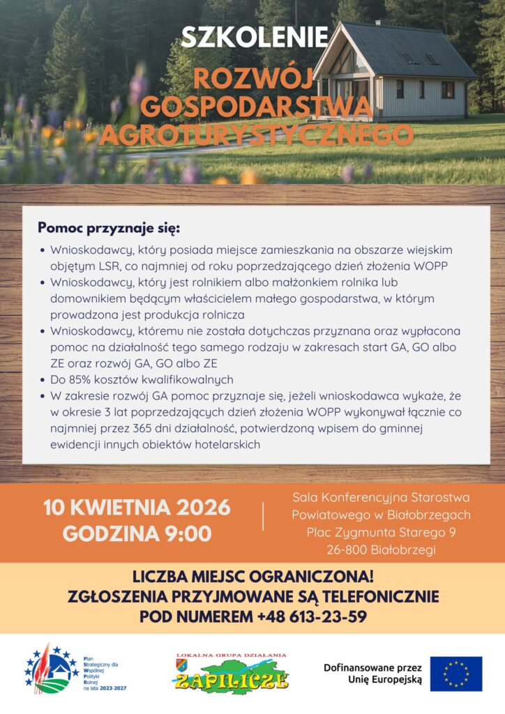 Szkolenie rozwój Gospodarstwa Agroturystycznego Zapilicze1 kwietnia 20261 kwietnia 2026 Lokalna Grupa Działania "Zapilicze" ← Szkolenie MOWES – Narzędzia AI dla Liderów zmiany Szkolenie start Zagrody Edukacyjnej →